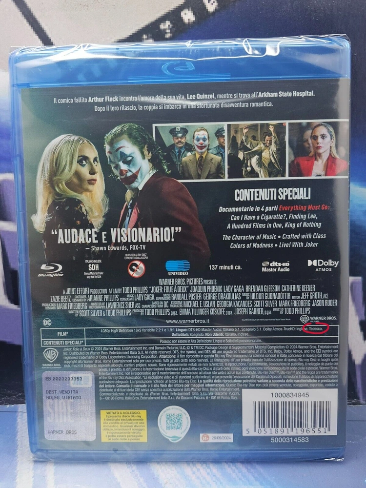 Laut Angaben bei bluray-disc.de und diesem Foto hat auch die italienische Blu-ray deutschen Ton drauf:Nur die 4K Blu-ray hat deutschen Ton.Ich weiß nicht obs bei dem Film jemanden interessiert aber den zweiten Joker bekommt man im Moment im 4K Steelbook für schlanke 18,04 Euro.... Hat laut Angaben im Netz auch deutschen Ton an Bord (gilt wohl für UHD und BD):