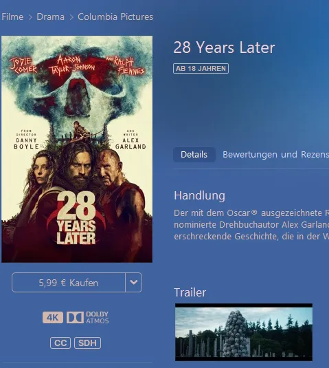28 hat bei Apple im gegensatz zu Netflix, wo der Film in Dolby Vision gestreamt wird, komischerweise HDR10+Hat 28 Years Later echt keine Form von HDR im iTunes Store? Da ist nur ein 4K und Dolby Atmos Symbol.