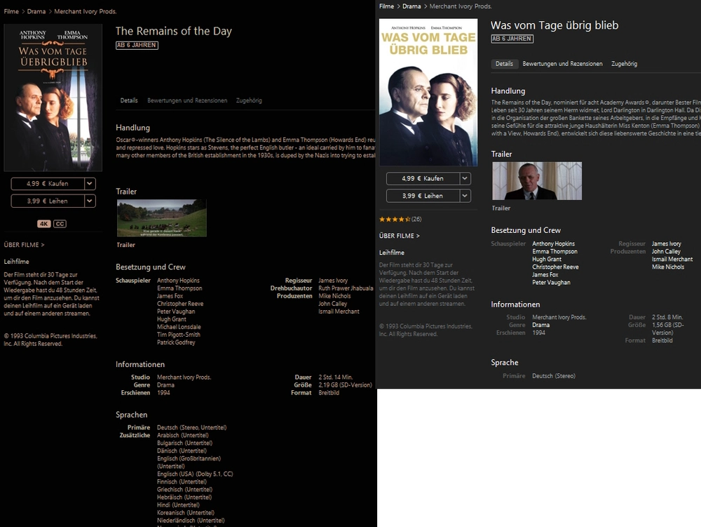 Dazu dann noch die Bewertungen, die aber auch schon etwas älter sind:Die Listung nur mit deutschem Audio muss die SD-Version sein und die mit mehr Sprachen die 4K-Version. Allein durch die Sprache des Titels lässt es sich ja auch ganz gut unterscheiden.
