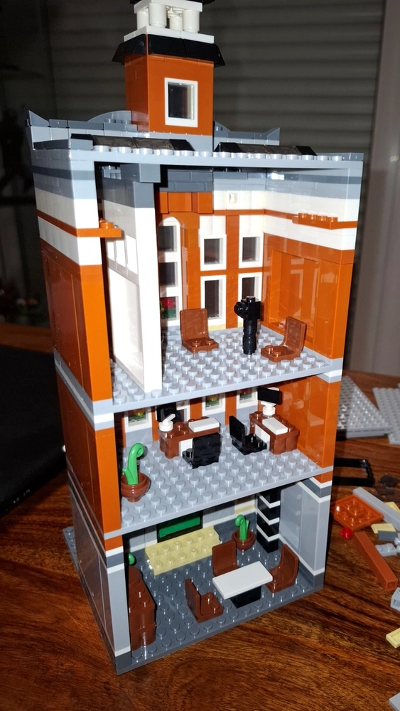 Nichtsdestotrotz ist das Rathaus schlecht konstruiert. Die Eingangstür unten würde nach außen gar nicht aufgehen weil der Giebel darüber zu tief sitzt. Hab sie jetzt einfach nach innen aufgehen lassen. Zudem fehlen unter den jeweiligen Stockwerken Querbalken zur Stabilisierung der großen Platten. Hatte ich jetzt auch keine zur Hand, deshalb hab ich da keine verbaut. Die Aktenschränke mit Schubladen fehlten in beiden Sets, deshalb sieht es auch eher karg möbliert aus.