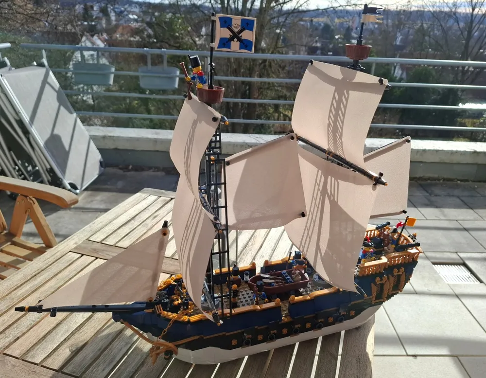 Wenn das Ding dann aber fertig gebaut ist hat man ein prunkvolles Schlachtschiff vor sich das optisch schon was hermacht. Die Figuren und Marineflagge sind von Lego.