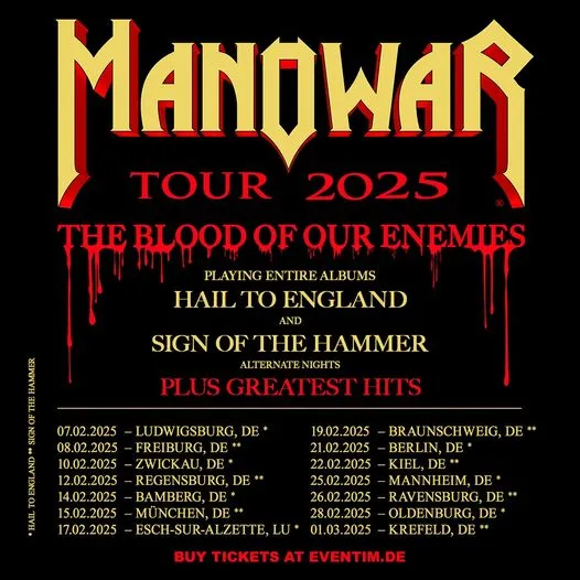 Schade, wir hatten sehr gute Plätze.Preise für Kiel:Manowar haben Ihre Tour für 2025 bekanntgegeben und dabei Joey DeMaio's Spoken Word Tour für dieses Jahr abgesagt.