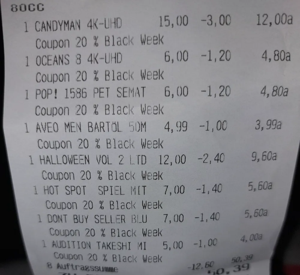 Oh okay? Trat das nur bei dieser speziellen Box auf oder bei den "normalen" Hitchcock Boxen auch? Muss das bei mir mal checken - habe da eine aus Italien oder so meine ich. Die Vögel aber noch nicht geschaut.Nur englische Tonspur vorhanden.Wieso? War war da bei die Vögel?Denk an den Austausch bei "Die Vögel".Hab gerade ein paar Sachen bestellt. Zudem gibt es in der App noch einen 20%-Coupon auf alles*, gültig bis 30.11.2025. Denke aber nicht, dass er bei der Abholung dieser Bestellung funktioniert aufgrund der Ausschlüsse. Bei den Preisen aber kein Problem. Es gab noch einige Sachen mehr zum quasi halben Preis.