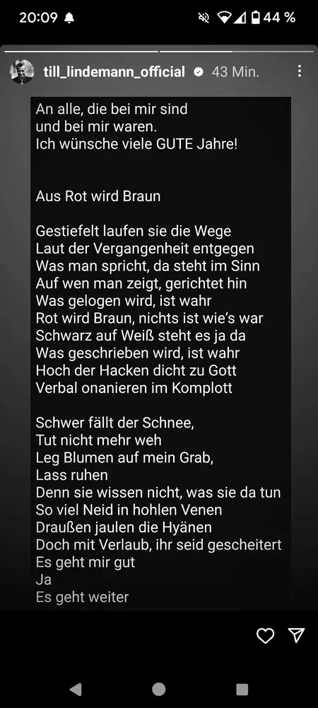 Manche Menschen haben einen unwiderstehlichen Drang zur Wiederholung.Klar ist das der rechte Zeitpunkt. Aber man darf hier Henne und Ei nicht verwechseln. Das Album und die Tour waren ursprünglich eh schon vor zwei Jahren geplant wie gesagt. Und selbst jetzt: Ich habe meine Lindemann Tickets für Frankfurt schon vor dem Skandal gekauft. Also die jetzige Tour war dann in der Form auch schon vor dem Skandal so geplant (sicherlich auch die Mexiko Konzerte dann nächstes Jahr). Also dass das jetzt alles wegen dem Skandal so läuft oder bewusst deshalb gemacht wird, kann man so nicht sagen.