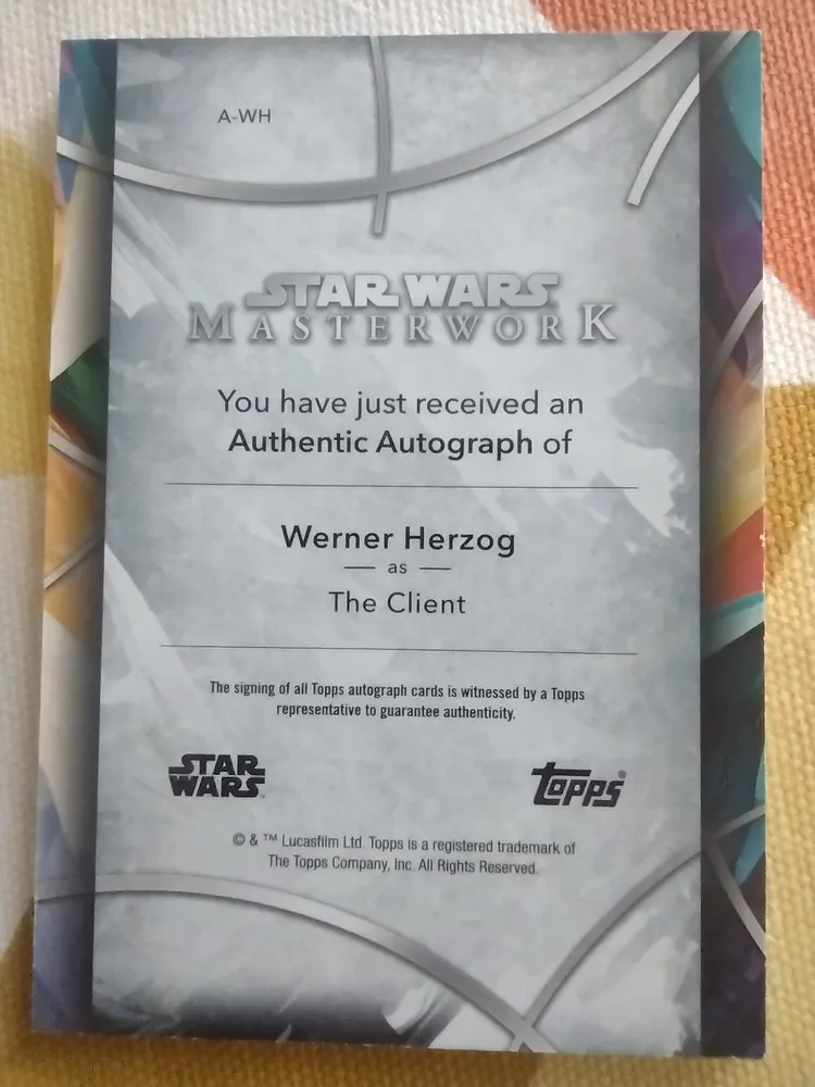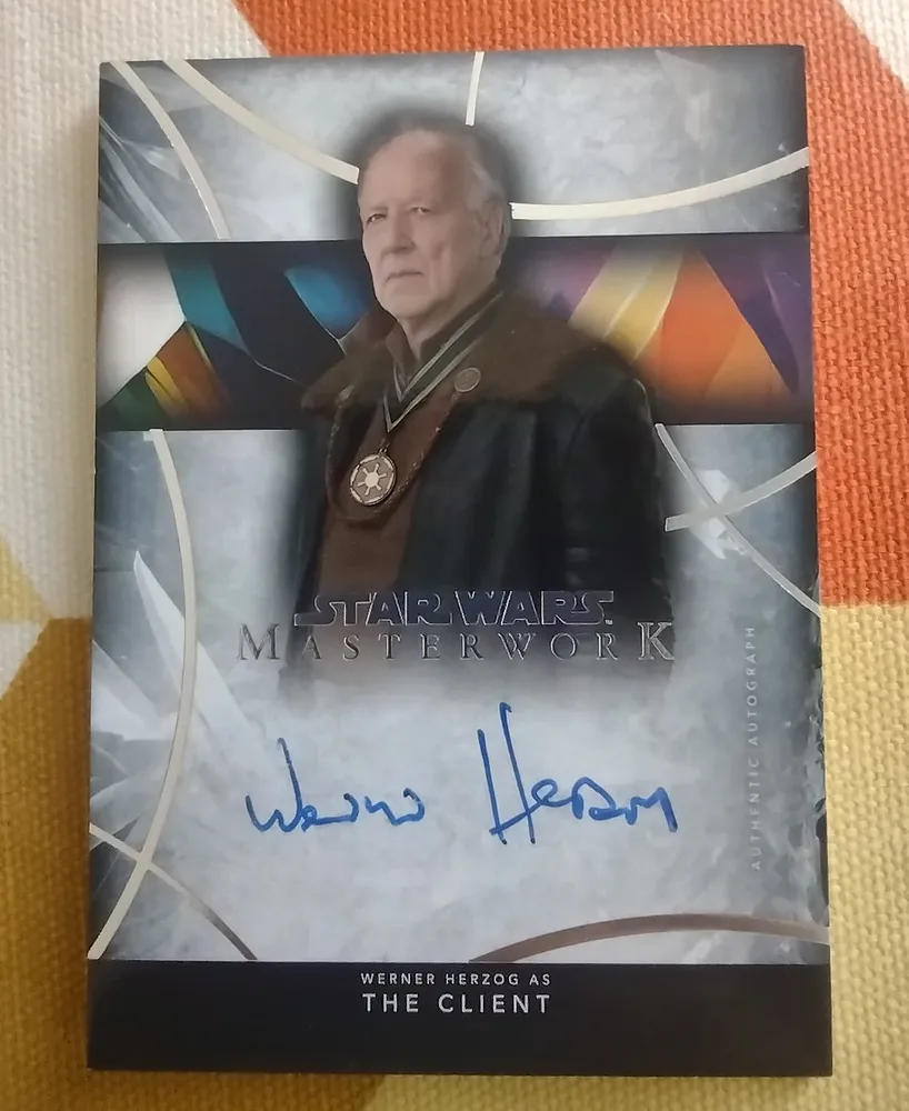 Hab mir ebenfalls Herzog über ebay gegönnt da ich ihn als Regisseur sehr schätze und seine Rolle in The Mandalorian großartig fand. Die Trading Card Welt richtet sich ja schon lange nicht mehr nur an Kinder, weder im Sports- noch im Entertainment Bereich. Bei Preisen für Boxen die teilweise jenseits von 1000€ liegen bin ich mittlerweile zwar auch ausgestiegen. Vereinzelt schlage ich dann aber, wie hier, gerne zu.Sammel- und Tradingkarten kenne ich hauptsächlich aus dem Sportbereich. Neulich sah ich, dass es auch welche von Star Wars gibt. Das interessiert allerdings eher nur den Zehnjährigen in mir. Sehr interessant aber fand ich die signierte Topps Star Wars Karte meines Lieblingsregisseurs Werner Herzog. Insofern habe ich da über ebay eine aus Amerika ersteigert.