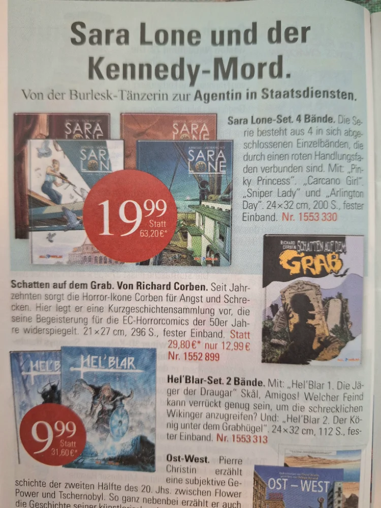 Merkheft Zweitausendeins hat mal wieder super Comicangebote im Sortiment. Ich habe heute morgen den neuen Katalog zugeschickt bekommen und gleich zugeschlagen. Unter anderem alle 4 Bände der Hammer Agentenserie "Sarah Lone" (60er Jahre) für unschlagbare 19,99 Euro! Oder beide Hel'Blar Bände (Wikinger Fantasy) für nur 9,99 Euro. Und viele andere!